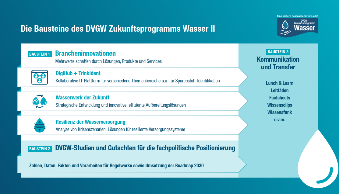 Mit dem DigiHub und Trink-Ident soll eine digitale Arbeits- und Austauschplattform für die Wasserversorgung entstehen. Neben Tools zur Netzwerkbildung und zum Wissenstransfer sollen über die Plattform auch unmittelbar fachlich fundierte, datengetriebene Dienstleistungen und Services zur Unterstützung betrieblicher Abläufe von Wasserversorgungsunternehmen bereitgestellt werden. Ein modularer Aufbau soll es dabei erlauben, den Betrieb einzelner Module zu spezifischen Themenbereichen (z. B. Analytik, Aufbereitung, Risiko- und Asset-Management) abzudecken.
