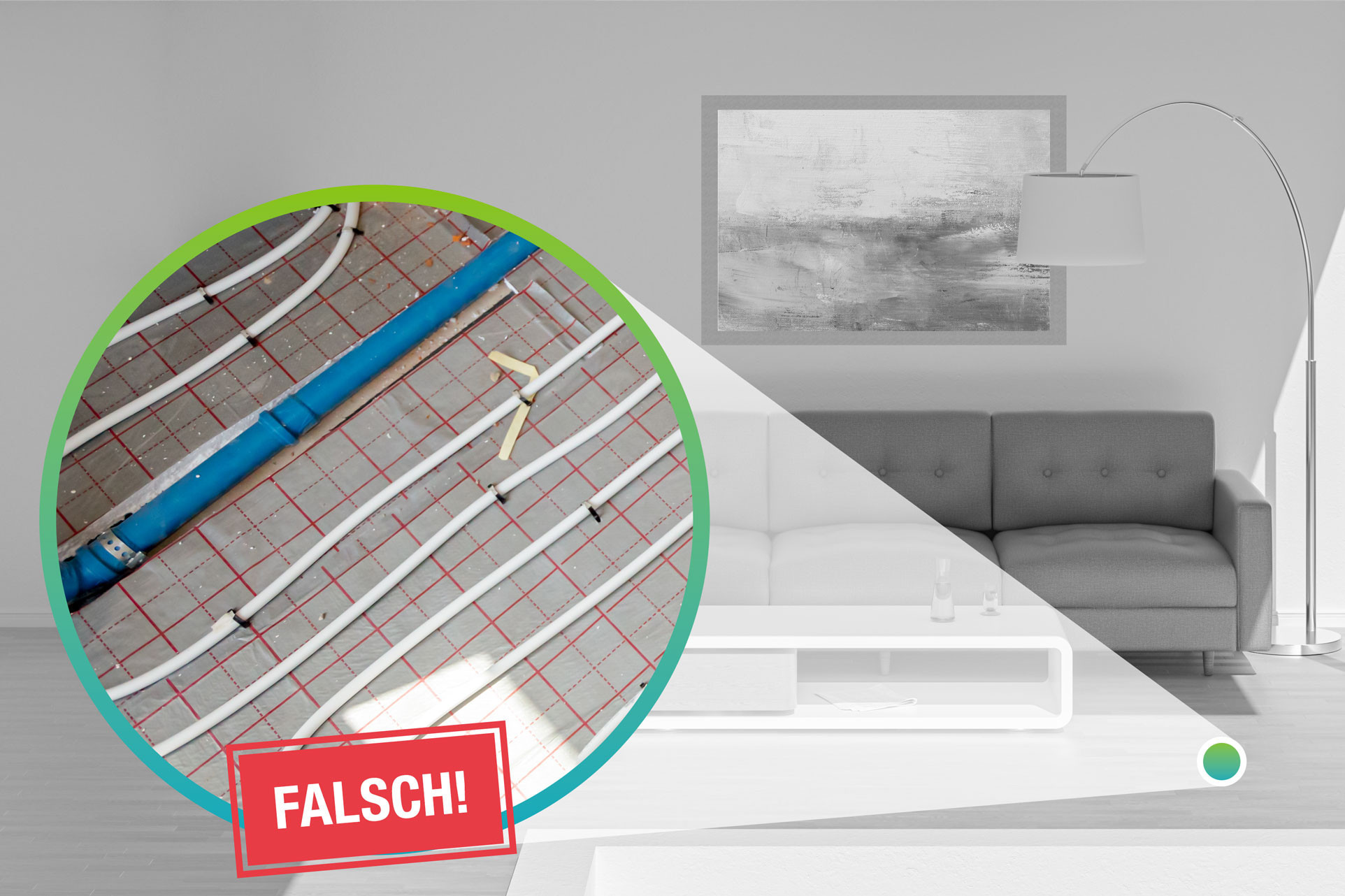 Diese Verlegung in einer Fußbodenheizung ist gefährlich: Da die Kaltwasserleitung zu dicht an der Heizspirale der Fußbodenheizung liegt, besteht die Gefahr der Legionellenvermehrung.
